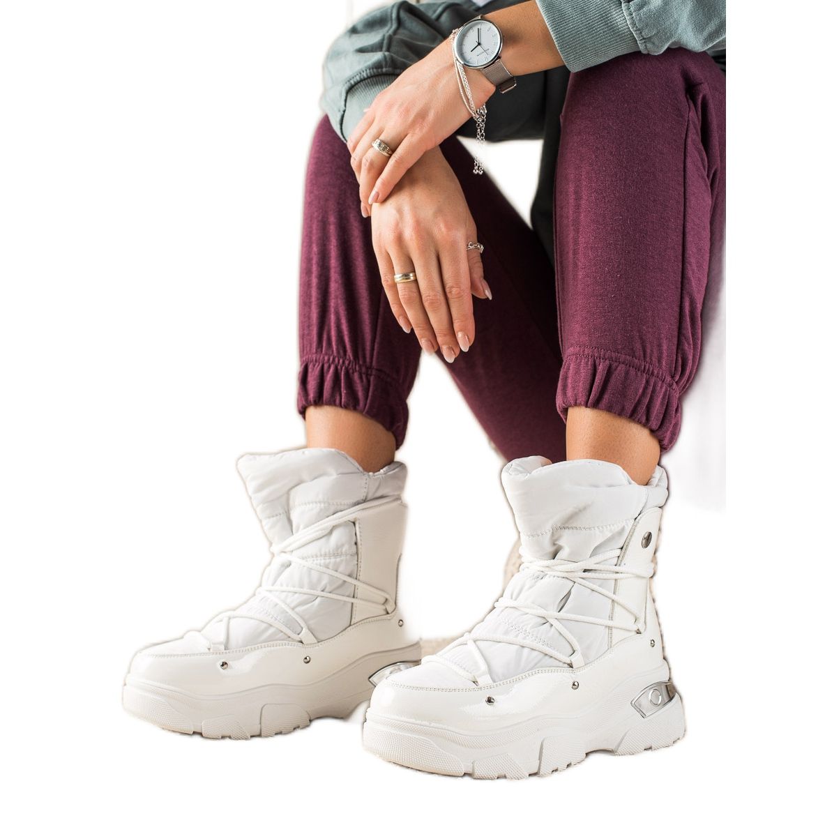 W. Potocki Classic White Potocki Snow Boots är ett utmärkt val för kvinnor som vill kombinera komfort och en moderiktig look i vardagen. Dessa snygga snökängor kännetecknas av en hel tå och en mjuk, inbyggd häl, vilket säkerställer inte bara komfort, utan också ordentlig fotstabilisering.