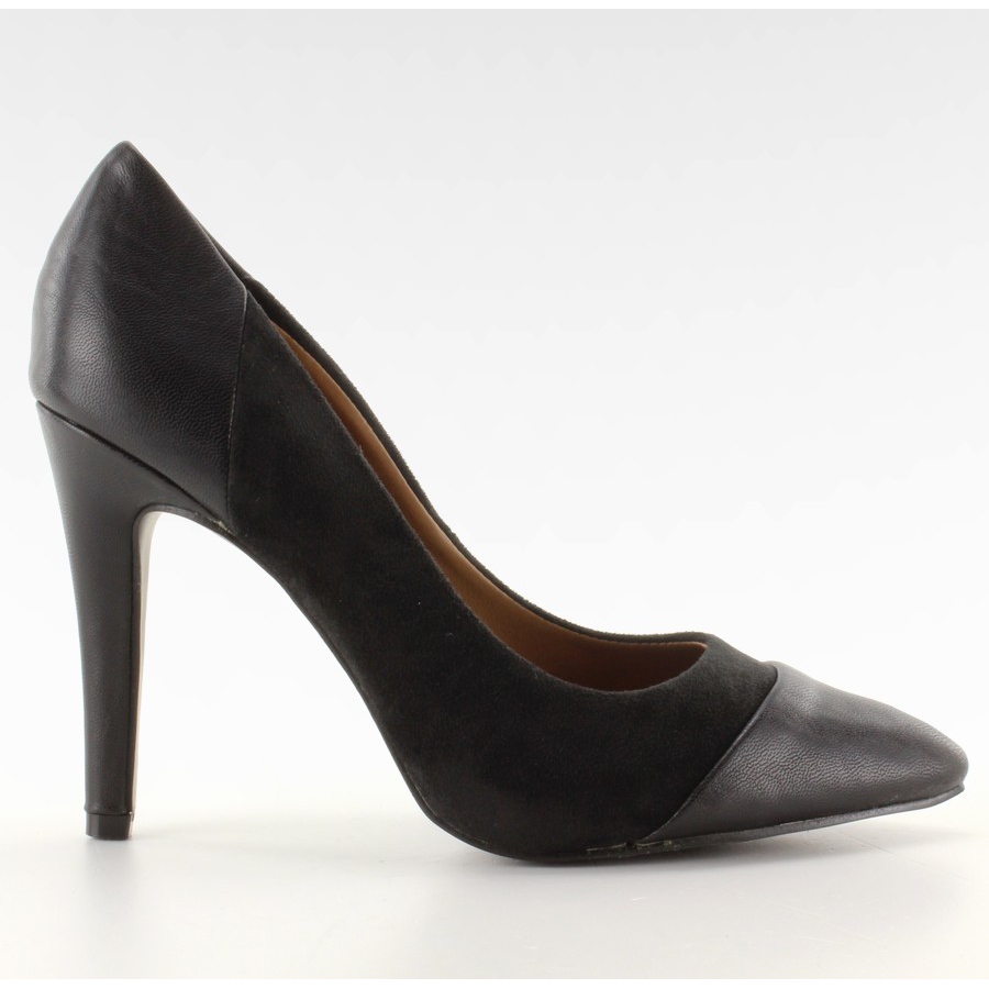 Klassiska höga klackar E364 - eleganta pumps i tidlöst svart, kombinerar två finisher: delikat eko-mocka och slätt, ekologiskt narvskinn. En smal, spetsig tå och en hög stilett (11 cm) gör figuren smal, vilket ger stilen en chic look - perfekt både för kvällsutflykter och för att framhäva en vardaglig, elegant look.