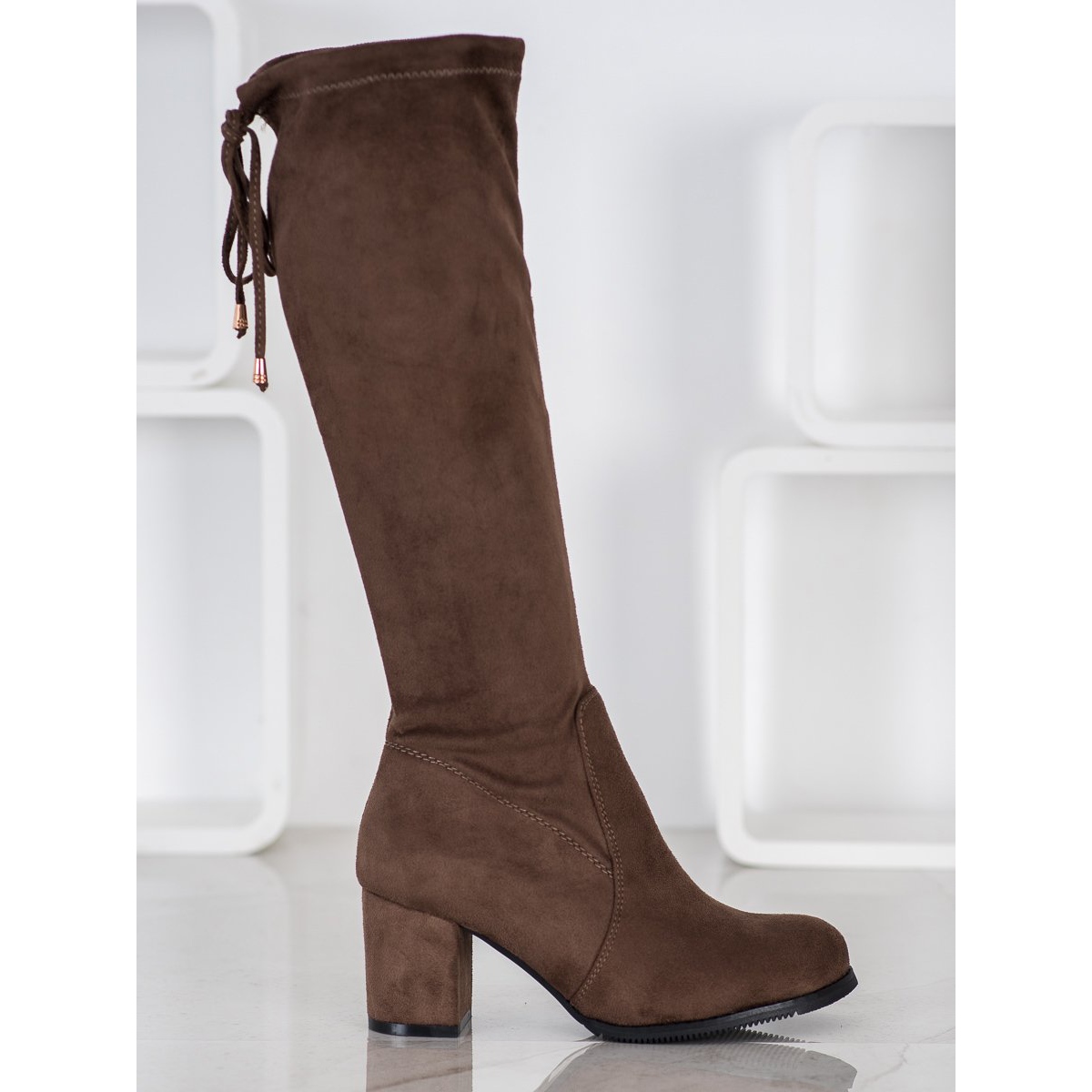 Upptäck elegansen och komforten som erbjuds av bruna klassiska stövlar från J. Star! Dessa unika damskor kombinerar moderiktig design med funktionalitet, perfekt för både vardagsbruk och kvällsutflykter. Höga knähöga stövlar med 40 cm ovandel är gjorda av ekologiskt läder imiterad mocka, vilket ger dem en elegant, stilren look.