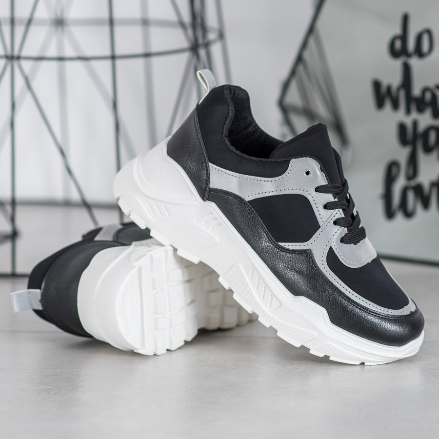 Den klassiska svarta färgen gör SHELOVET sneakers perfekta för både sport och fritidsset. De passar perfekt med jeans, leggings eller klänningar, vilket ger elegans och fräschör till varje styling. Sneakersen har en rund tå, vilket säkerställer komfort för tårna, och snörning ger en perfekt passform till foten.