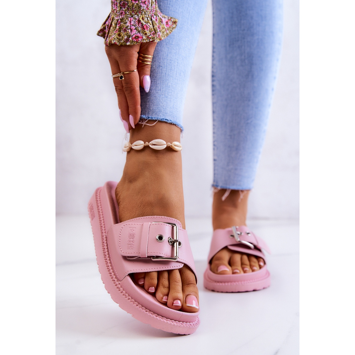Eleganta, bekväma och universella big-stjärna flip flops i en delikat pulverrosa är ett måste för vår-sommarsäsongen. Modellen gled med ett justerbart bälte fäst med ett spänne kombinerar en enkel form med praktiska lösningar: Profilerad insats och en liten plattform säkerställer komfort under dagen.