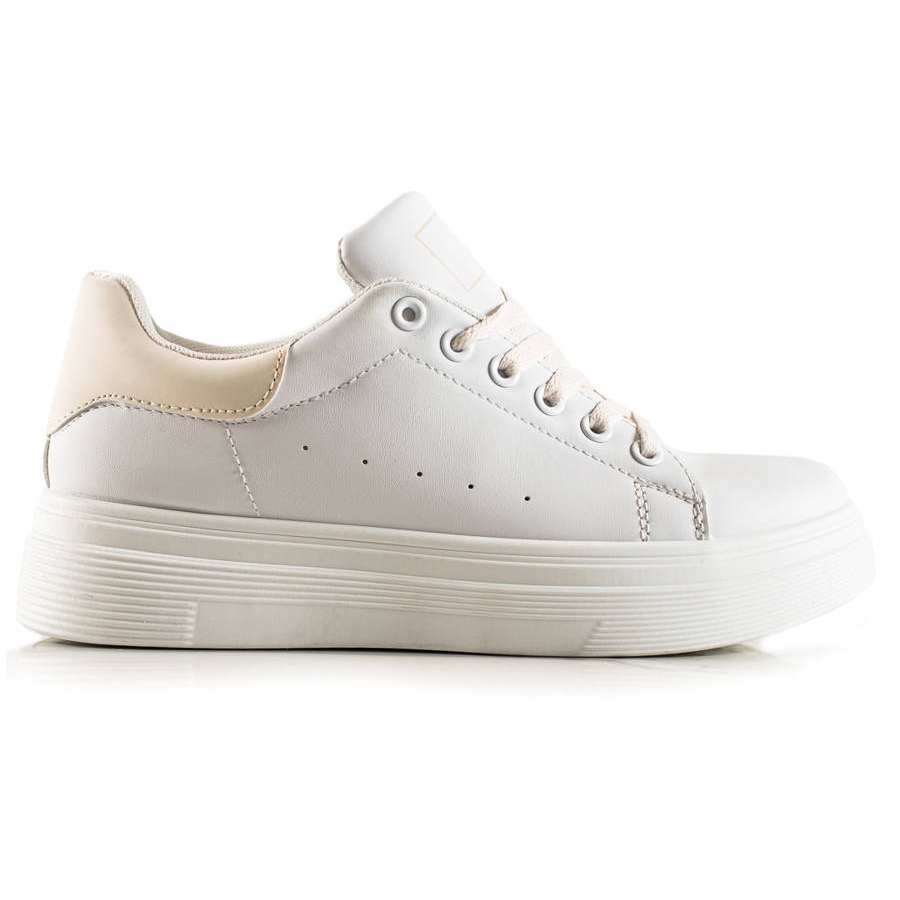 Ideal Shoes sneakers är en modell med en 4 cm hög plattform, vilket ger lite höjd samtidigt som användarkomforten bibehålls. Deras universella vita färg gör att de matchar många stilar – både sportiga och vardagliga.