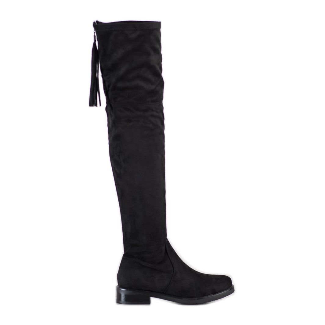 Svarta musketörer med fransar från märket Bestelle är ett perfekt val för den kommande höst- och vintersäsongen. Tillverkade av ekologiskt läder som imiterar mocka, kombinerar de elegans med komfort, perfekt matchar den avslappnade och klassiska stilen. Tack vare den övre räckvidden ovanför knäet ser dessa skor inte bara vackra ut, utan ger också ett bra skydd mot kylan.