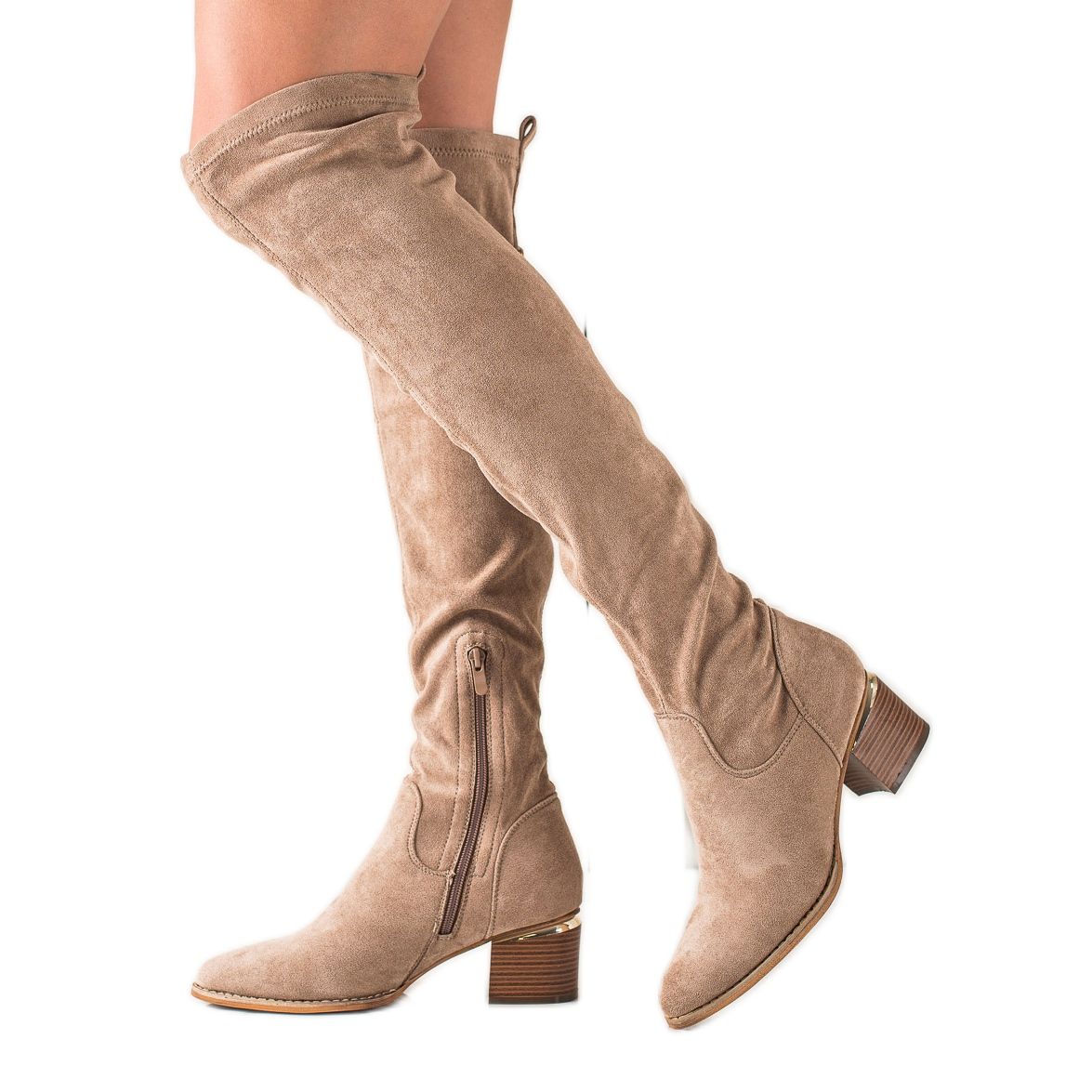 Stövlarna kännetecknas av en hög ovandel ovanför knäet, som inte bara framhäver figuren, utan också säkerställer optimal isolering under kallare dagar. Häldisken är stängd och förstyvad, vilket garanterar stabilitet och komfort vid användning. Användningen av högkvalitativ mockaimitation och syntetmaterial i sulan ger klass och elegans till skorna.