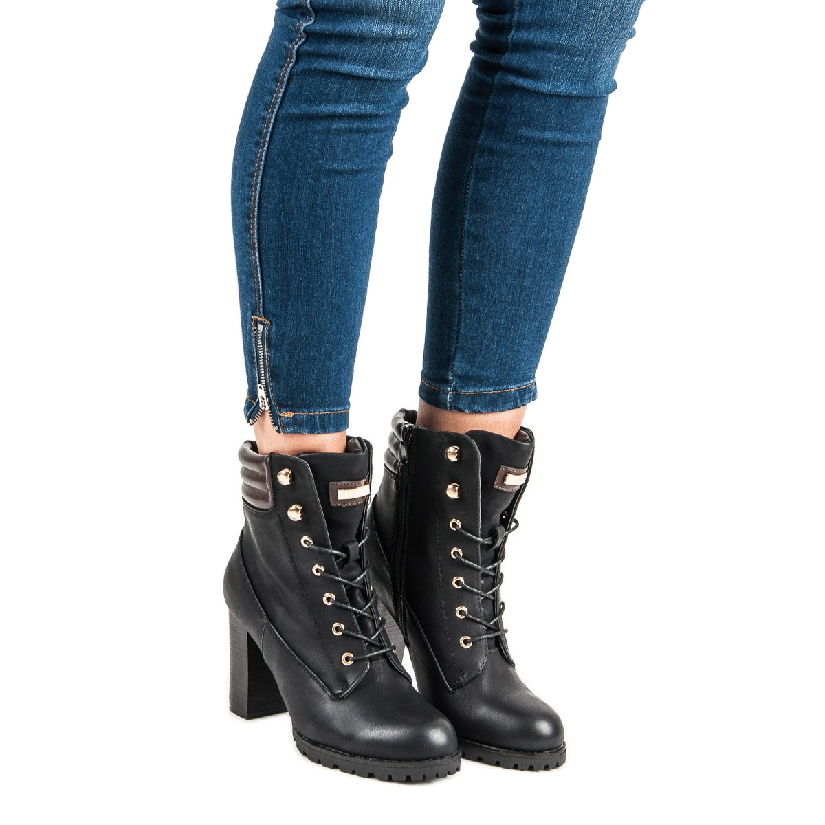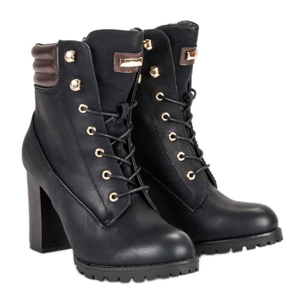 Upptäck elegans med KAYLA högklackade ankelboots i en klassisk svart färg. Dessa snygga skor, dekorerade med bruna och gulddetaljer, är perfekta för både avslappnade och mer eleganta stilar. De har en 9-centimeters stång som tillför elegans, samt en dragkedja och ömtåliga snören som gör det lättare att ta på dem.