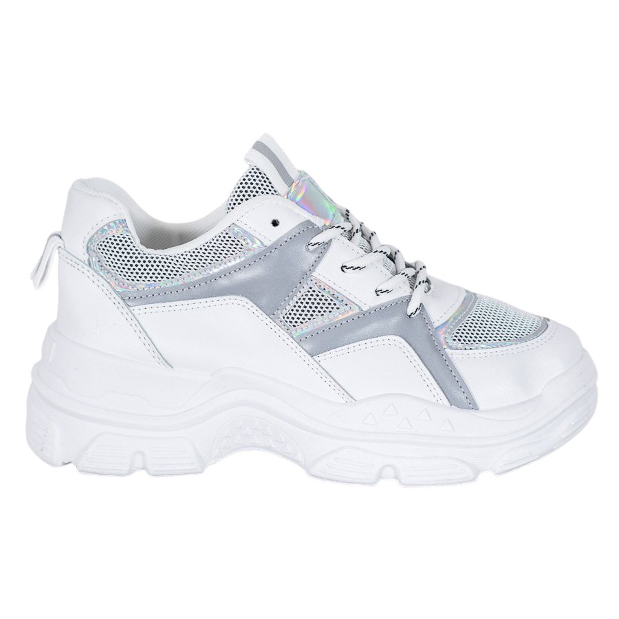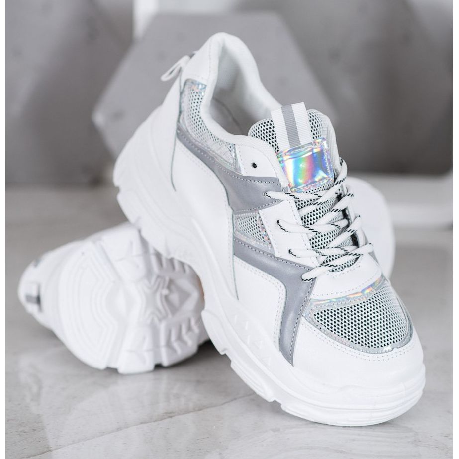 Tillverkade av högkvalitativt material som imiterar läder, vita och gråa sneakers är perfekta för alla årstider. Silveraccenter lägger till elegans, vilket gör dem till ett perfekt komplement till urban stil. Den höga plattformen, 5,5 cm hög, framhäver inte bara den feminina stilen, utan säkerställer också bärkomfort.