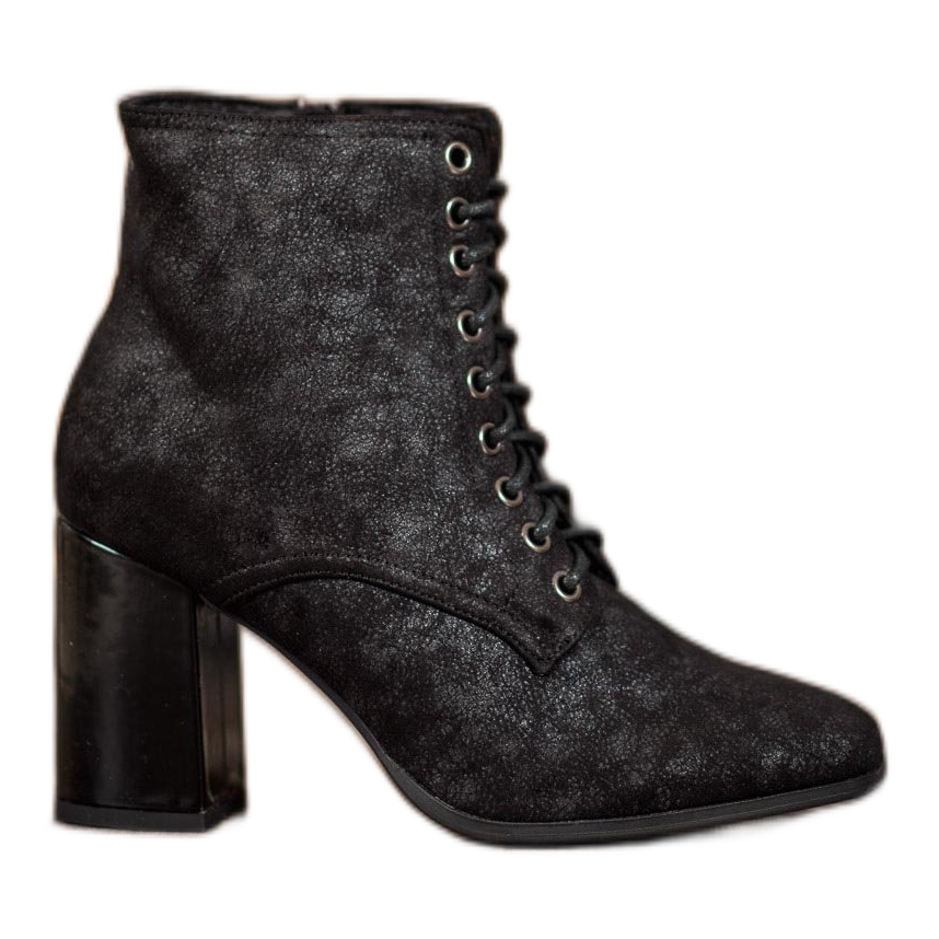Stövlarna har en stabil 8,5 cm blockklack, vilket säkerställer komfort under hela dagen. Den ankellånga ovandelen är dekorerad med praktisk snörning framtill och dessutom försedd med en dragkedja på insidan, vilket gör det lättare att ta på dem.