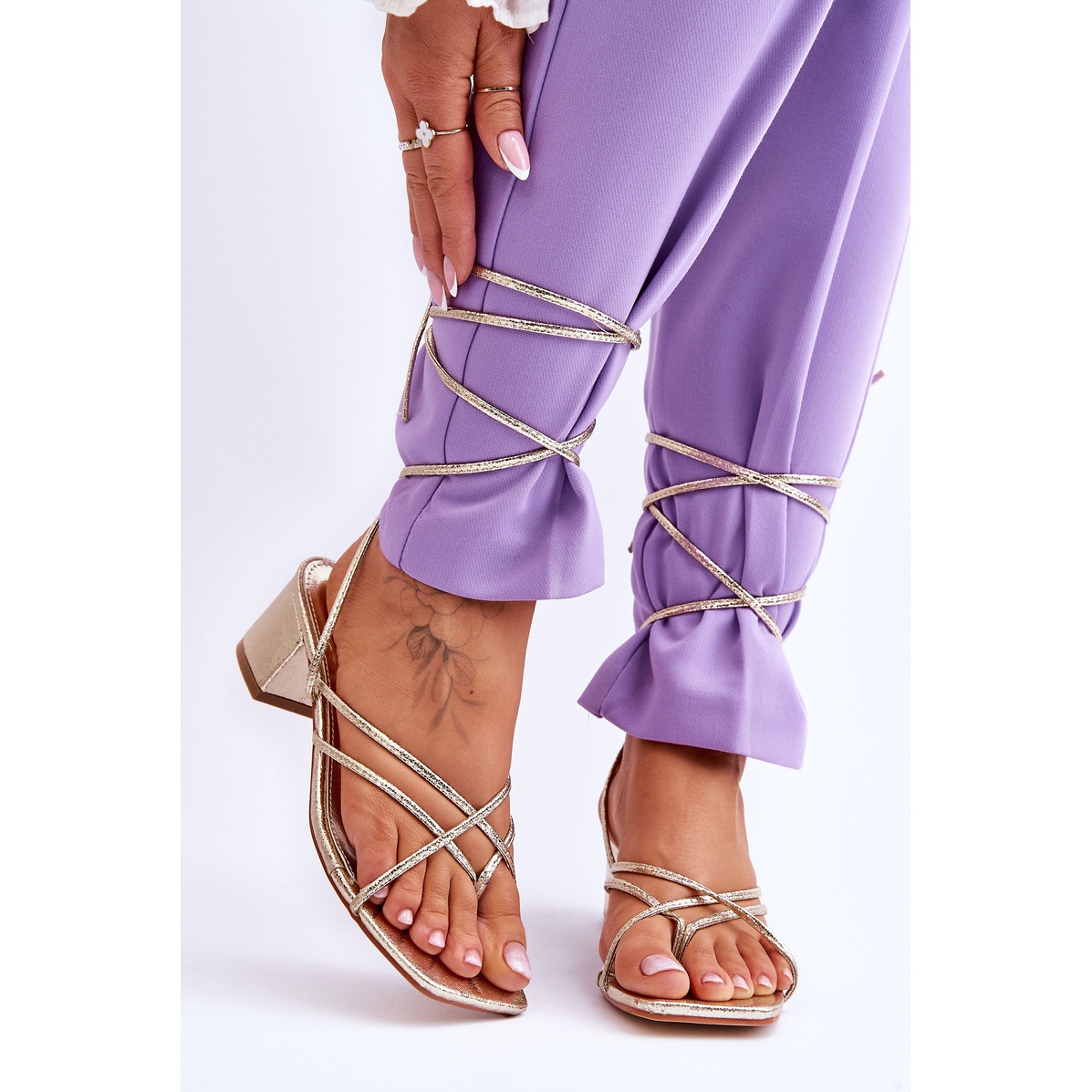 Lyftade sandaler med gyllene hemliga kärleks klackar - elegans och lätthet varje dag och för speciella tillfällen. Delikata ränder i det japanska snittet och bindningen runt kalven betonar den feminina figuren, och den låga stolpen (5 cm) säkerställer stabilitet och komfort. Den upptäckta, fyrkantiga näsan ger modellen en modern karaktär, och den gyllene finishen kommer att ge prakt till alla stilisering.