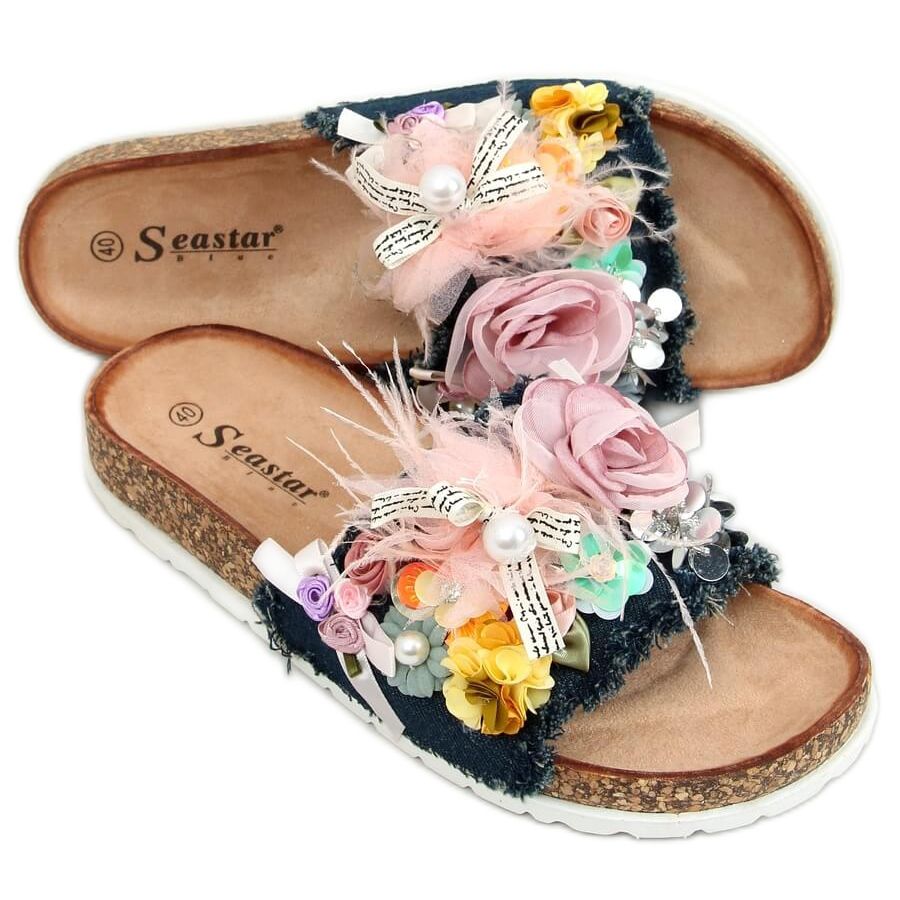 Detaljer: Kork tofflor med blommor BG61P Mörkblå marinblå mångfärgad