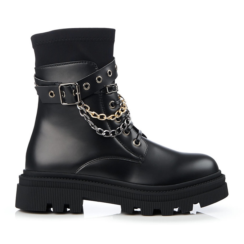 Vi presenterar unika damskor med kedjor från Shelovet, som kommer att glädja alla älskare av fashionabla och bekväma skor. Tillverkade av högkvalitativt ekologiskt läder och textilmaterial, dessa svarta ankelboots kombinerar elegans och rockstil, perfekt matchar en avslappnad, vardaglig look.