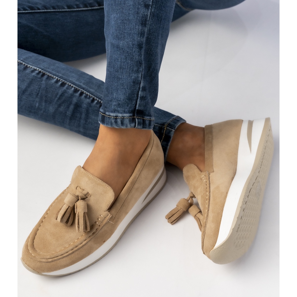 Upptäck elegans och komfort i form av kvinnors mockasiner med dårar i en subtil beige skugga. Dessa unika loafers på plattformen har noggrant gjorts av högkvalitativ mocka, vilket inte bara ger ett vackert utseende, utan också komforten att bära hela dagen.