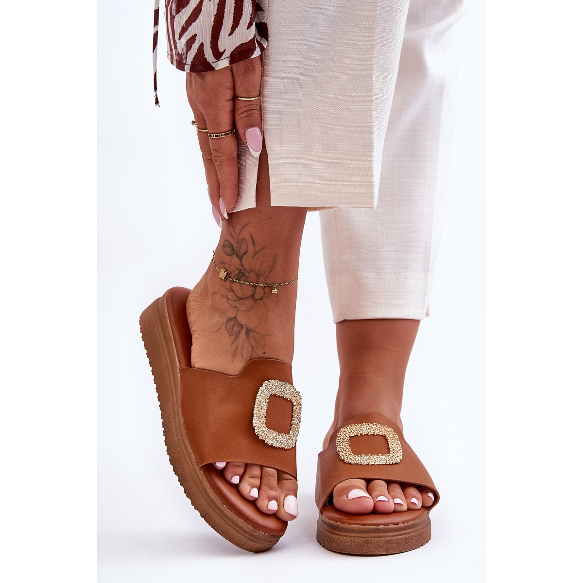 Upptäck de perfekta sommarskorna som kombinerar stil med komfort - Denicia plattformsrutschbanor för kvinnor i en elegant brun nyans. Dessa klassiska flip-flops är gjorda av högkvalitativt ekologiskt läder och är inte bara estetiska utan också funktionella och framhäver varje sommarstyling.
