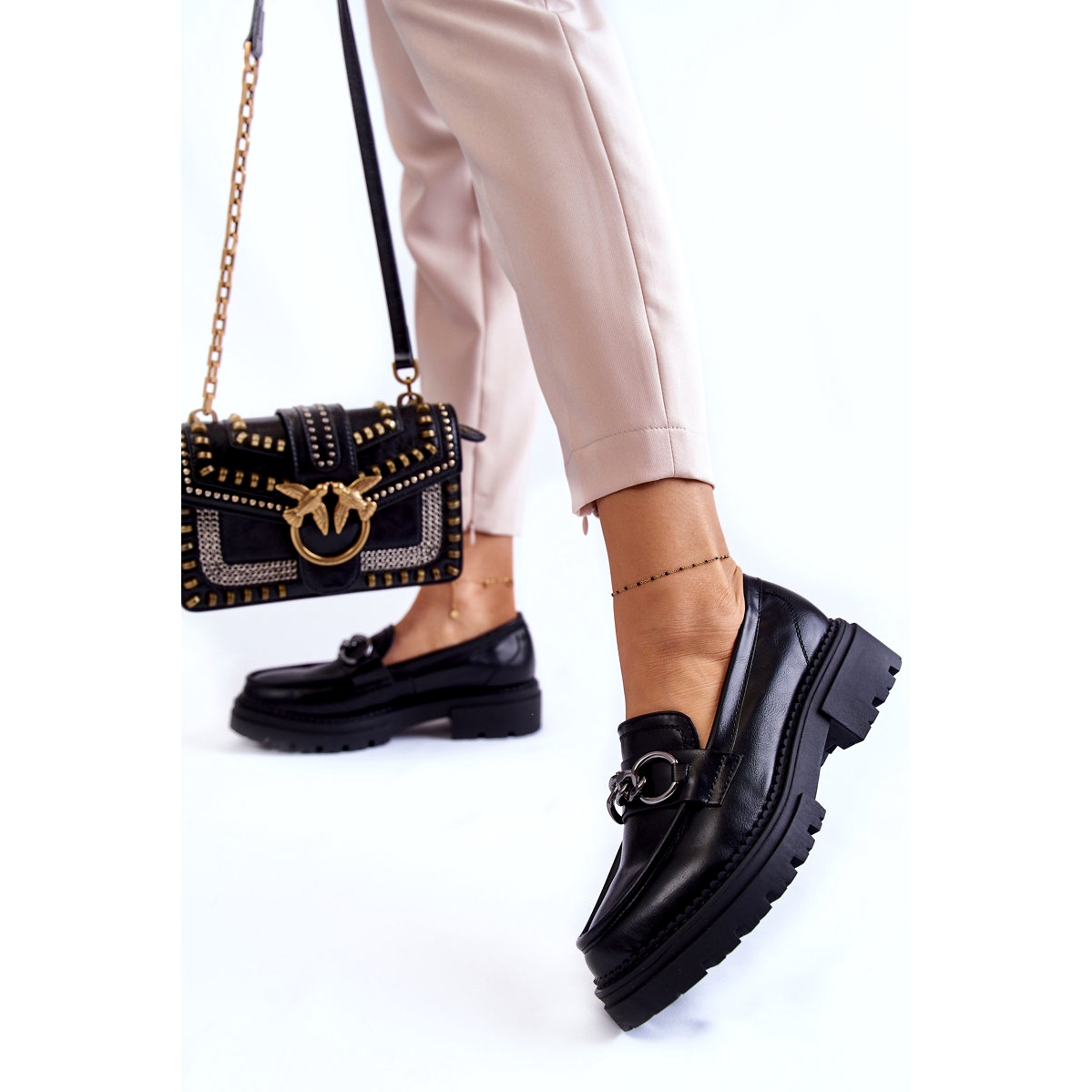 Kvinnors eko-läderskor la.fi-stiliga loays som kombinerar elegans med vardagens komfort. En slät, svart övre del av ekologiskt läder med hög kvalitet har dekorerats med en dekorativ kedja som lägger till karaktär och gör att skorna fungerar bra både för kontoret och för möten med vänner. En klassisk, rund näsa och en slip -i fästning garanterar bekväm att sätta på och bära hela dagen.