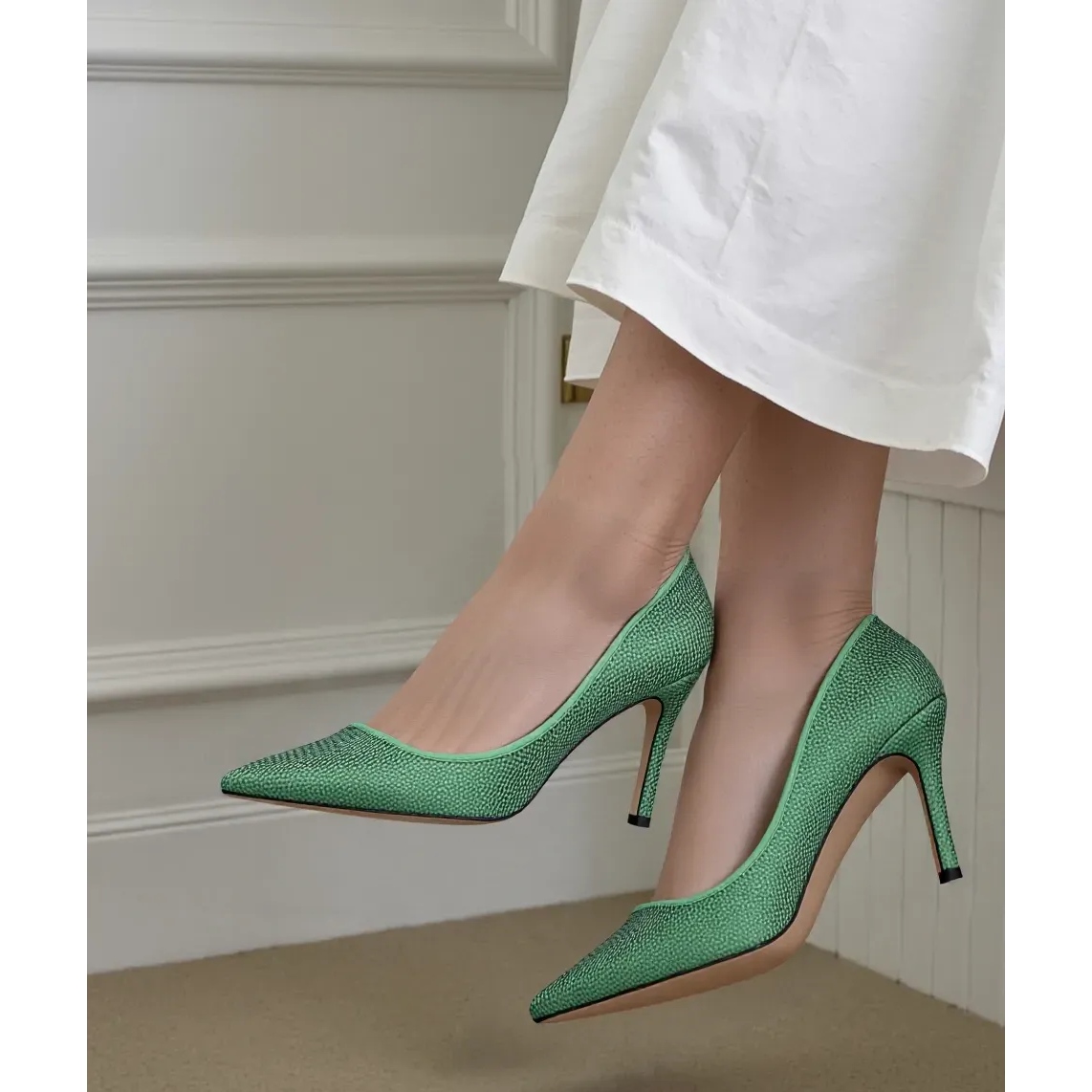 Elysian Green Women's Pumps är kvintessensen av elegans och sofistikering, vilket säkert kommer att locka allas ögon. Tillverkad av högkvalitativ brokadtyg erbjuder de en unik glans, vilket ger dem en lyxig karaktär. Deras intensiva gröna färg gör dem till ett idealiskt val för kvällsutflykter, banketter eller andra unika tillfällen.