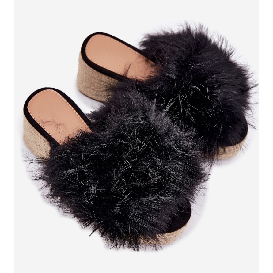 Detaljer: Kvinnors flip flops med kil med päls och fläta svart