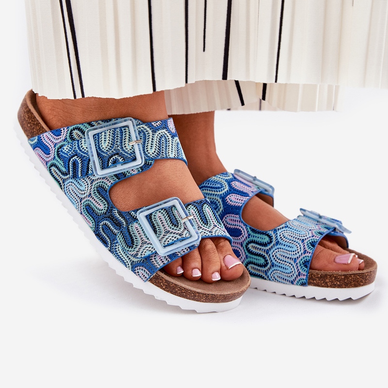 Här är de perfekta flip flops för sommardagar-kvinnors flip flops med spännen och glitter S. Barski RB51-006 i blått. Tillverkade av textilmaterial av hög kvalitet är dessa mönstrade flip flops på en bekväm korkplattform med en höjd av 3 cm, vilket gör dem inte bara snygga, utan också mycket bekväma.