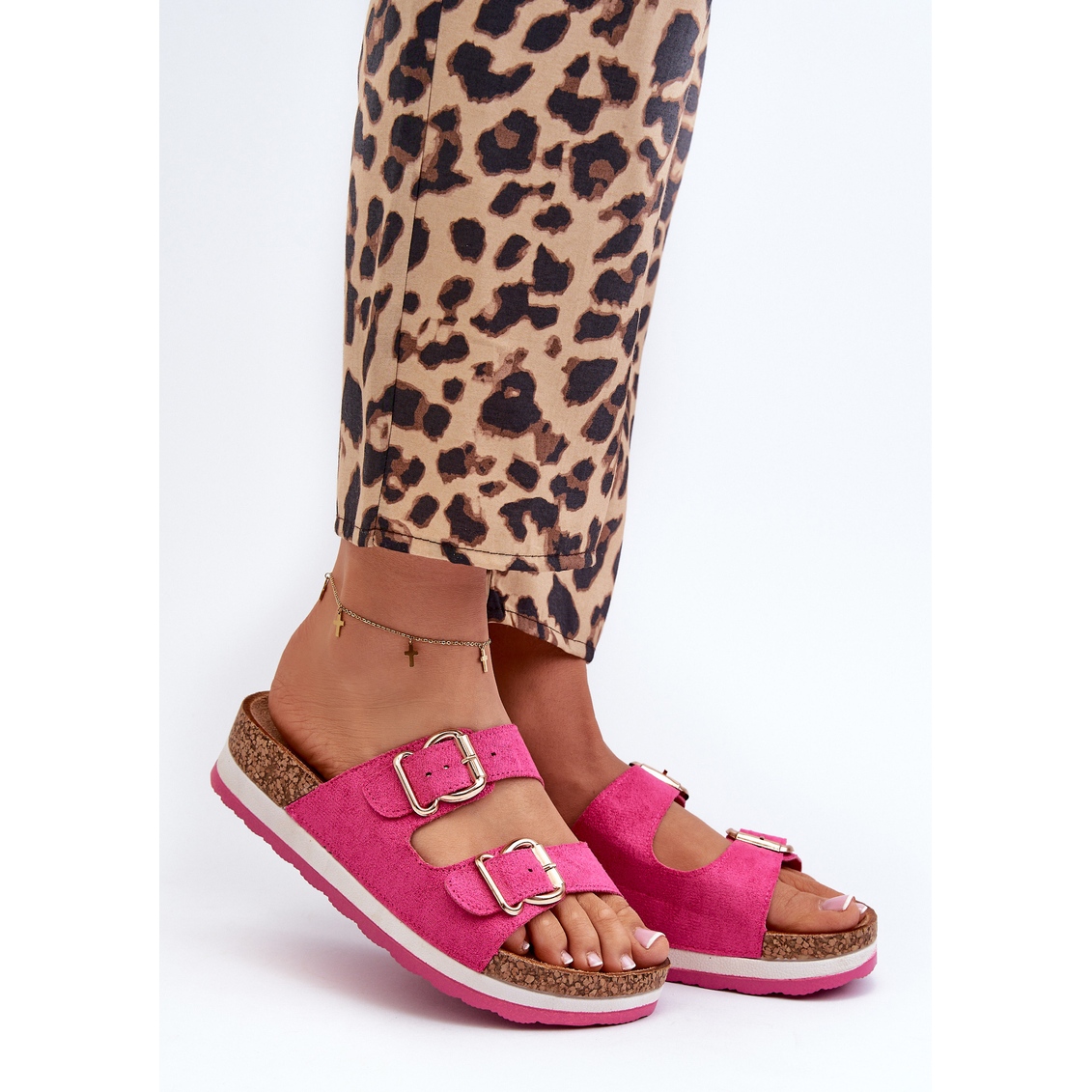 Dessa flip flops är utrustade med två justerbara ränder, dekorerade med gyllene klämmor, vilket ger dem en nypa lyx. Tack vare möjligheten att matcha remmarna till individuella behov kan du njuta av perfekt komfort, oavsett tillfälle. Den profilerade Eco Suede -insatsen bryr sig om stöd för fötterna, vilket gör dem till en bra lösning för långa promenader och aktiva dagar.