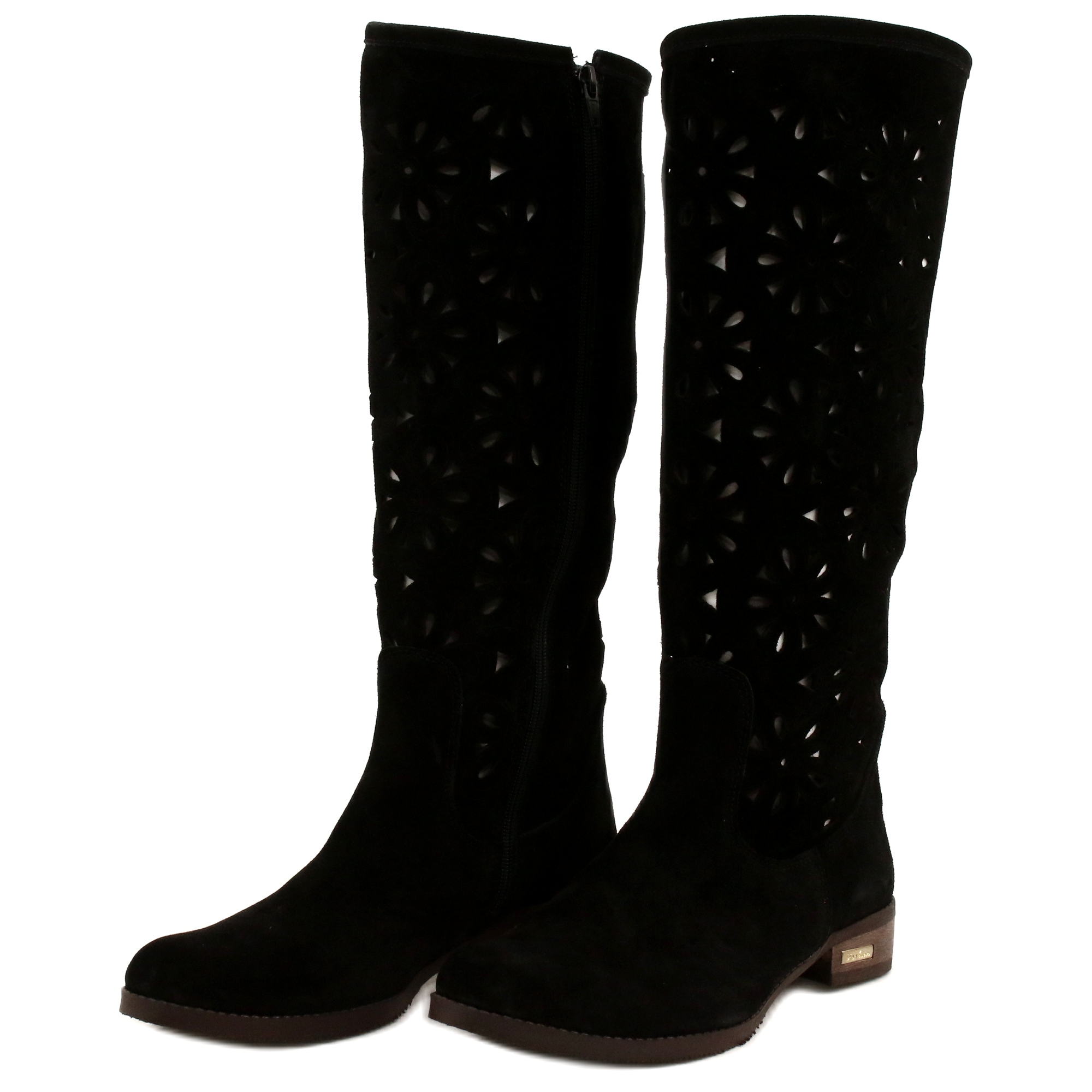 Eleganta, lätta och bekväma kvinnors stövlar från Olivier - perfekt på våren och hösten. Tillverkad av naturläder (nubuk / mocka), behagligt mjukt och lätt anpassar sig till benet. Den övre delen av den övre är dekorerad med ett öppet, geometriskt och blommönster, som ger skor en feminin och fashionabla karaktär.