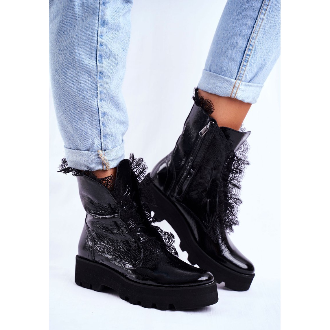 Stövlar av naturligt lack är dekorerade med dekorativ spets runt ovandelen, vilket ger dem en unik karaktär. Det bekväma inlägget av naturligt läder ger utmärkt ventilation och komfort, så att du kan bära dem i många timmar utan att känna något obehag.