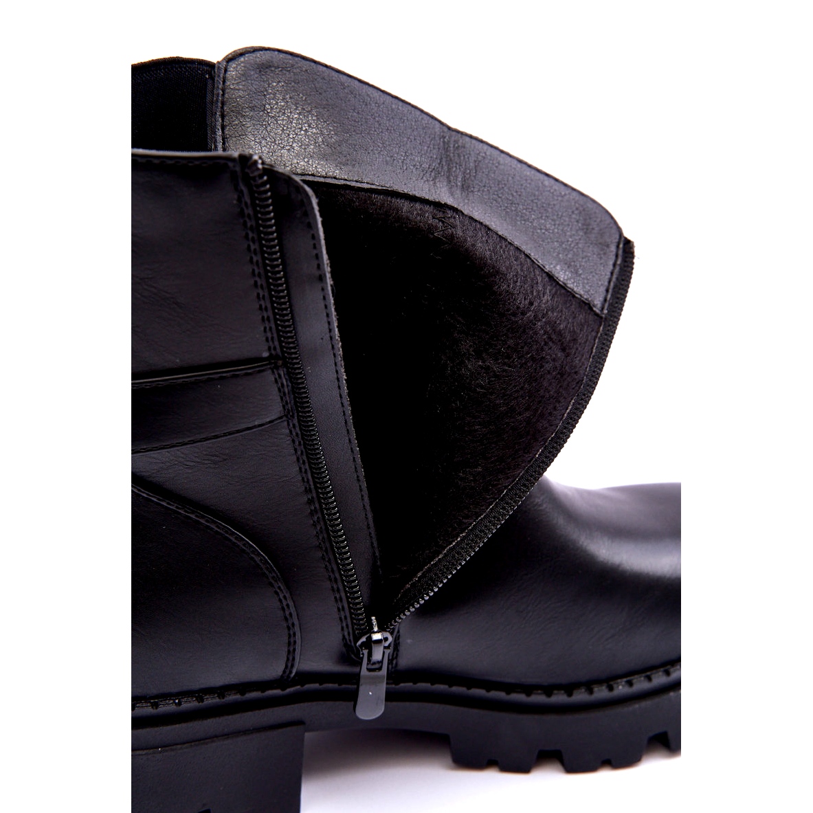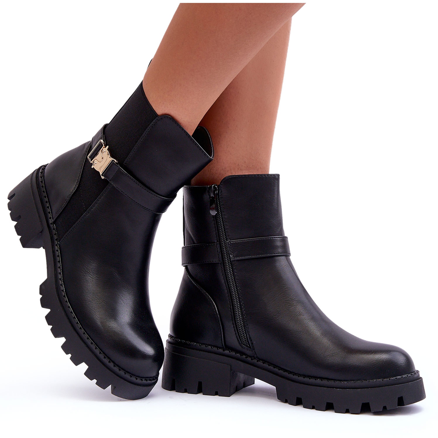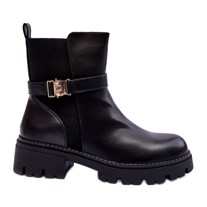Stövlar är fästade med ett praktiskt lås beläget på sidan, vilket gör det lättare att ta på sig och ta av. På den övre finns ett snyggt bälte med en prydnad, tillägger en hel karaktär och en unik stil. De är på en massiv plattform och platta klackar och garanterar stabilitet och komfort att bära hela dagen.