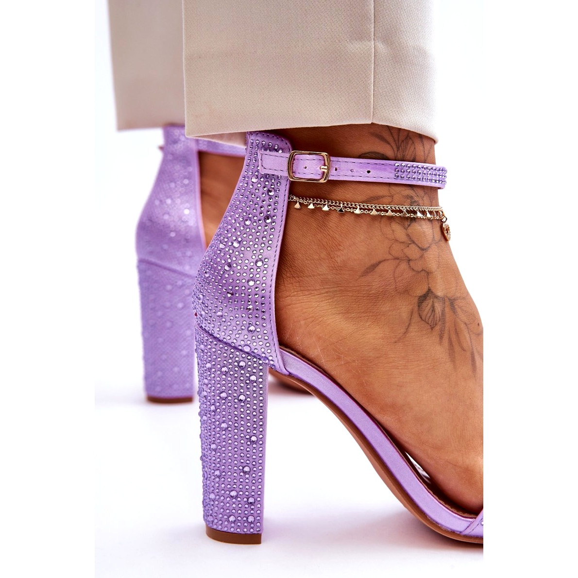 Den mjuka ekoläderinsatsen garanterar komforten att bära även under lång tid, och hälhöjden på 10 cm lyxar du benen och lägger till klass och stil till dig. En ytterligare fördel är strass som subtilt dekorerar sandaler, vilket ger dem en unik karaktär.
