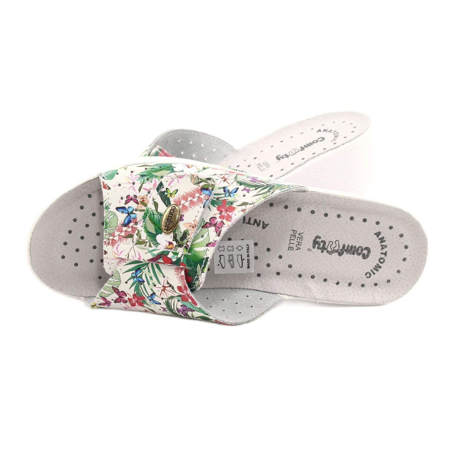 Elegant och samtidigt är bekväma Lucia från Comfoty ett förslag för kvinnor som värderar stil och komfort dagligen. Tillverkad av högkvalitativt naturläder - både övre och insatsen - säkerställer hållbarhet och trevlig användning. Tofflor kännetecknas av ett subtilt, mångfärgat blommotiv på en vit sula, som kommer att ge lätthet och feminin karaktär till sommarstyliseringar.