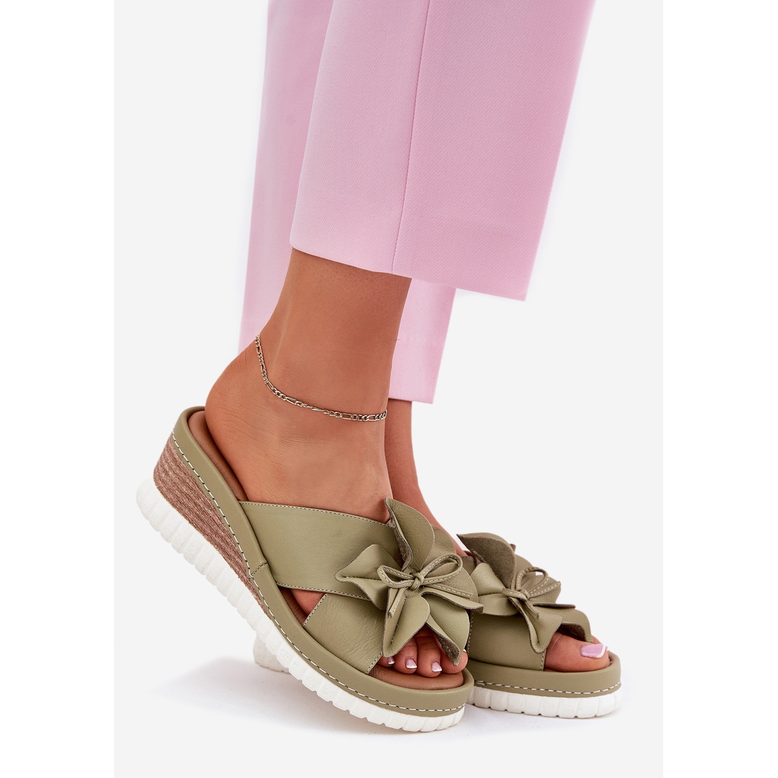 Flip -flops av hög kvalitet naturläder garanterar hållbarhet och komfort att bära. Deras inställning på en 7-centimeter kil tillför inte bara elegans, utan förlänger också optiskt benen. Fronten på skorna är dekorerad med en subtil blomma, som introducerar lätthet och unik karaktär för stiliseringen.