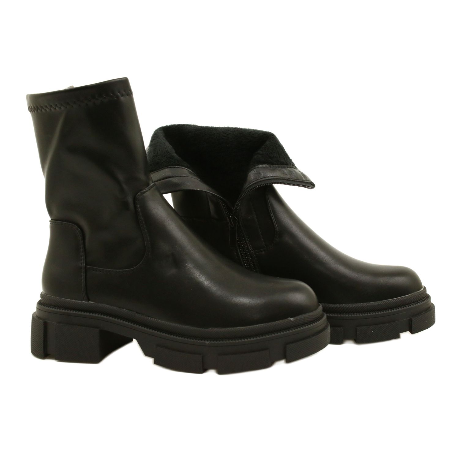 Eleganta och praktiska stövlar M. Daszyński MR2127-20 Kombinera ett modernt, massivt snitt med att bära komfort. Tillverkad av högkvalitativt ekologiskt läder, i den övre delen av den övre har en dragningslatex, vilket möjliggör en bättre passform för kalven. Interiören är isolerad med en delikat, tät päls, tack vare vilken skorna kommer att fungera på svalare dagar. En stabil, tjockare sula och en platt häl (höjd 5 cm) ger komfort under vardagsbruk.