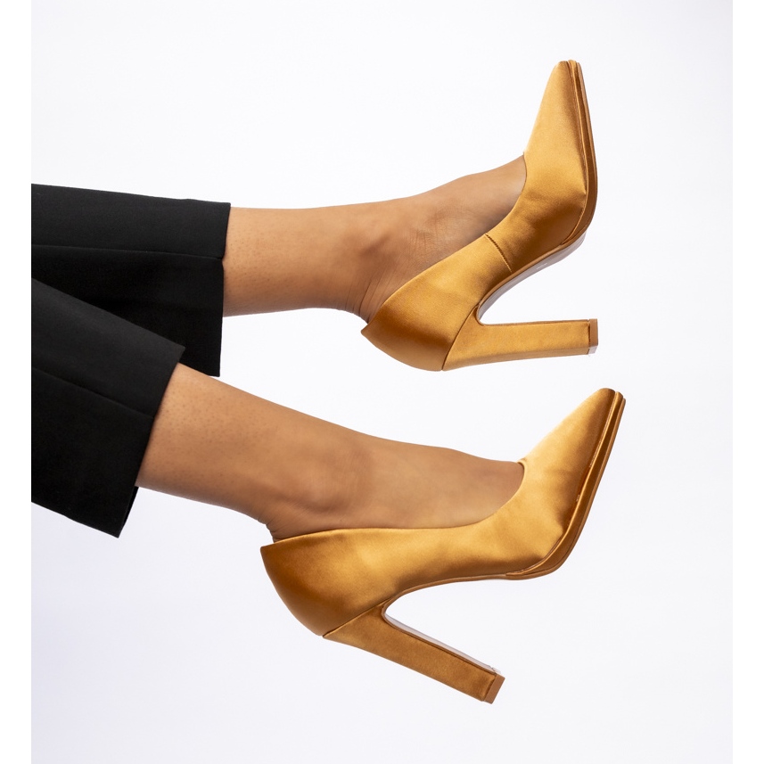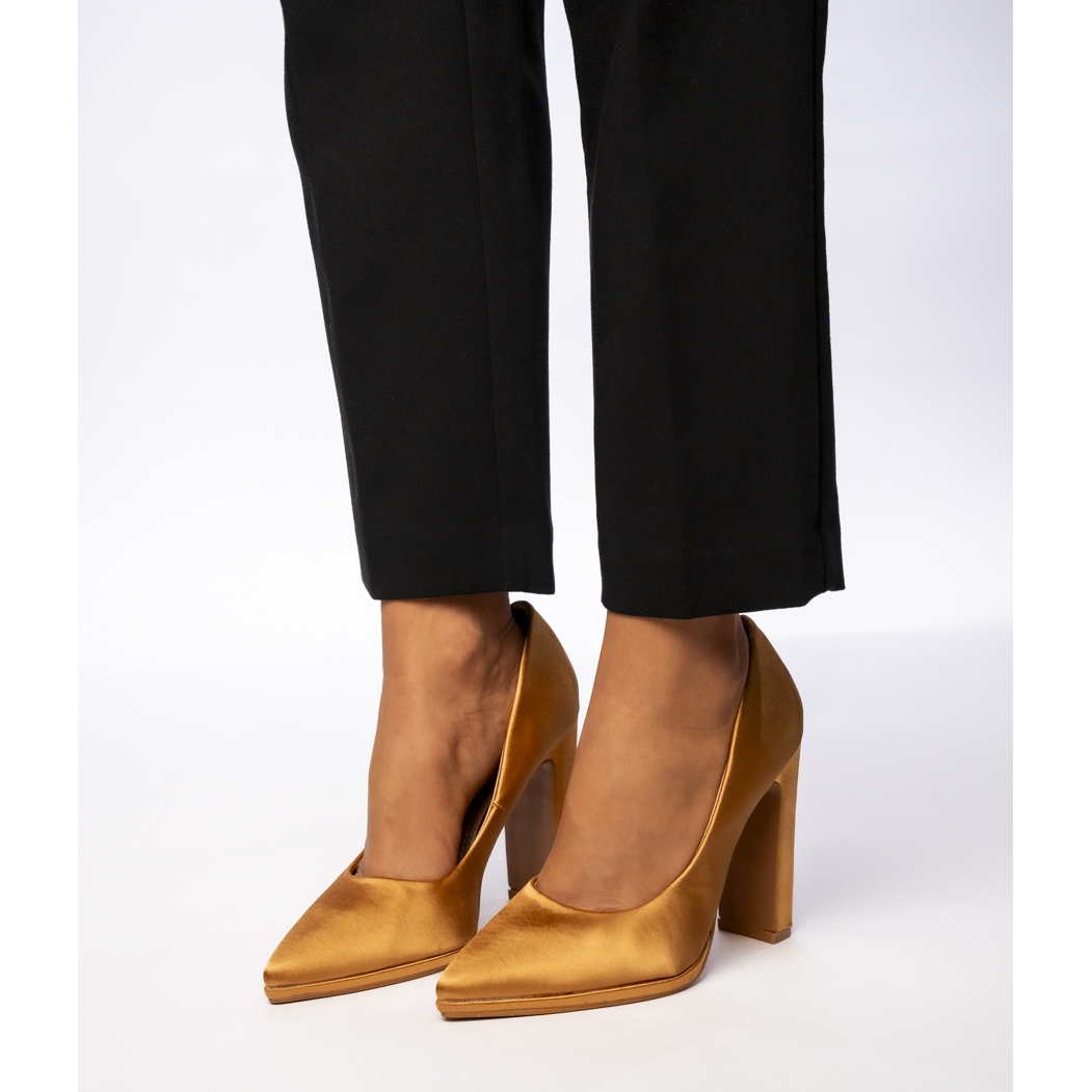 Den varma kamelskuggan och den subtila satinfinishen ger dessa pumpar en unik karaktär som fångar ögat och slutför varje elegant skapelse. Det höga inlägget smalar inte bara figuren, utan säkerställer också komforten att bära hela dagen, vilket gör dem till det perfekta valet under långa timmar på jobbet eller på fester.