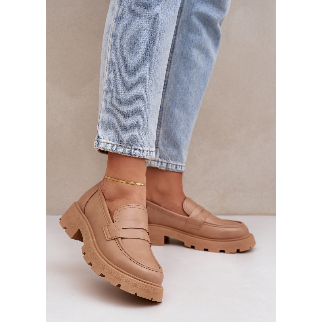 Tack vare rundtån ser loafers subtila och eleganta ut. Det är också värt att uppmärksamma deras tidlösa beige färg, som passar perfekt med många stilar och färger. De är perfekta för olika tillfällen, från promenader runt staden, genom möten med vänner, till mer officiella evenemang.