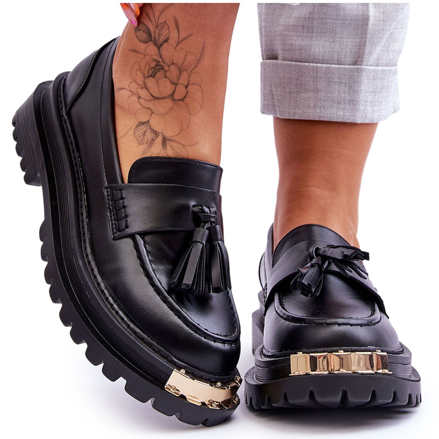 Eleganta, svarta loafers tillverkade av ekologiskt läder är ett förslag som kombinerar komfort med en fashionabla detalj. På framsidan finns en subtil, gyllene dekoration och mitt i de övre eleganta fransarna som lägger till karaktär och lätthet. Modellen är inställd på en stabil plattform 4,5 cm hög med en platt häl, vilket säkerställer komforten att bära hela dagen.