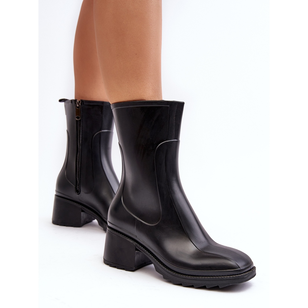 Kvinnors Matt Bertaida High Heels - Stil och funktionalitet för regniga dagar. Svart, matt snitt gjord av slitstark gummitast, inbäddad på en stabil, 6,5 cm blockhäl. Fäst med en blixtlås, med en fyrkantig näsa och ett mjukt tyginsats - en garanti för komfort även under längre bär. Perfekt för höststyliseringar när du behöver vattentät men elegant skor.