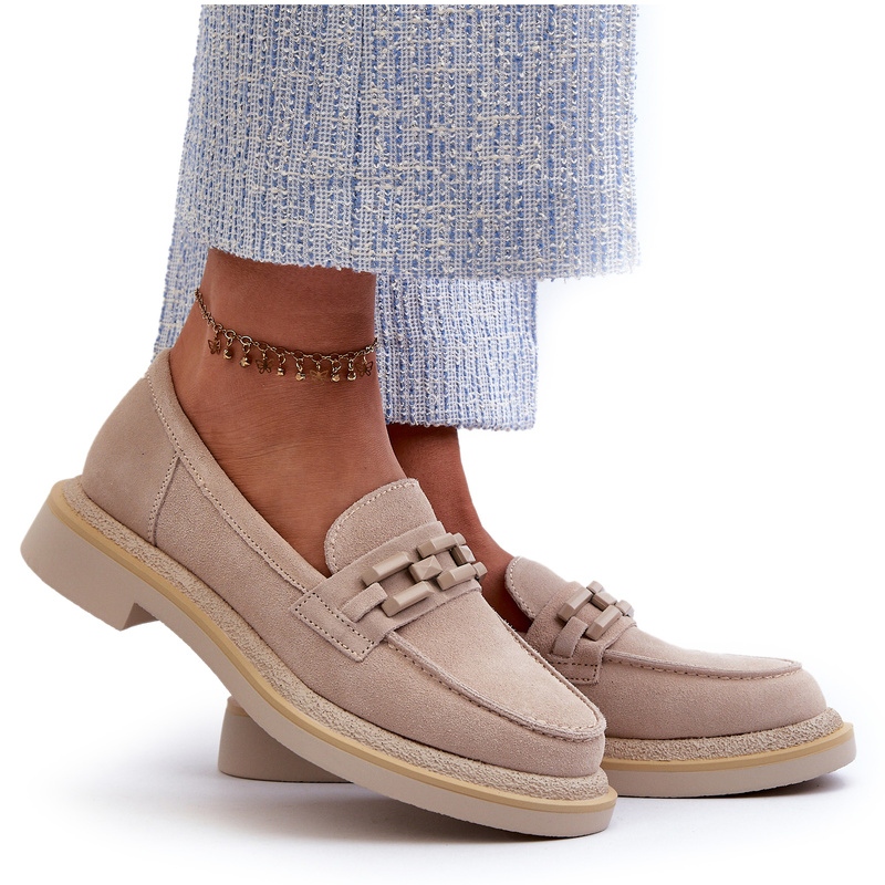 Kvinnors mockasiner S. Barski är ett elegant val för varje kvinna som värderar stil och komfort. Dessa unika skor i ljus beige färg är gjorda av högkvalitativ naturlig mocka, vilket gör dem inte bara trevliga vid beröring utan också extremt hållbara. Den 3,5 cm platta hälen säkerställer stabilitet, vilket gör dem till en idealisk lösning varje dag - även under långa promenader.