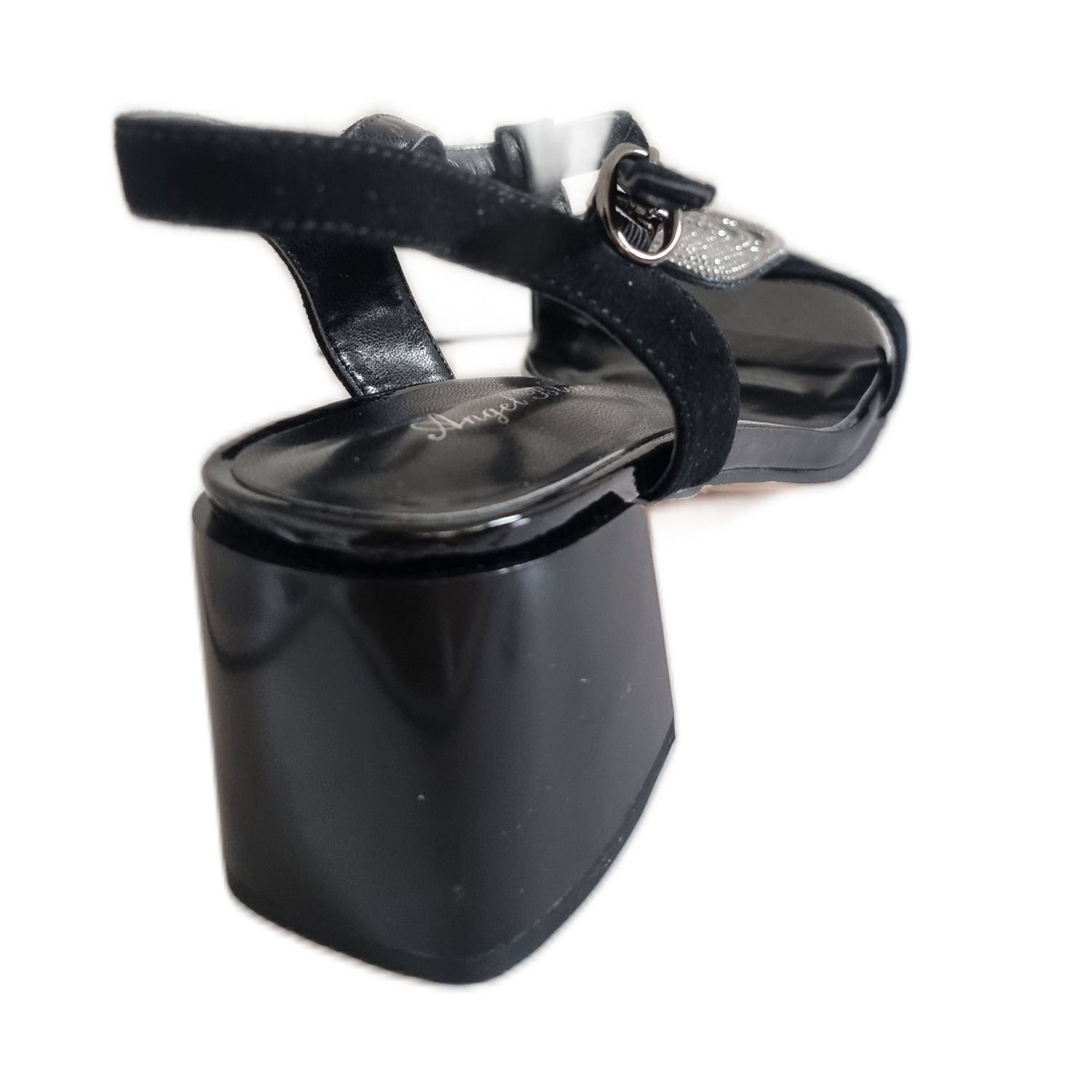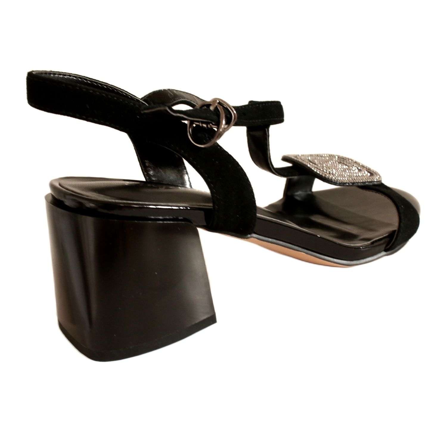 Kvinnors sandaler Angel Blue TN6415 Svarta höga klackar är ett extremt elegant val för varje kvinna. De är gjorda av naturligt mocka läder av hög kvalitet och kombinerar elegans och bär komfort. En massiv häl i form av en 6,5 cm hög post ger en säkerhet, samtidigt som man säkerställer stabilitet och bekvämlighet under dagliga aktiviteter.