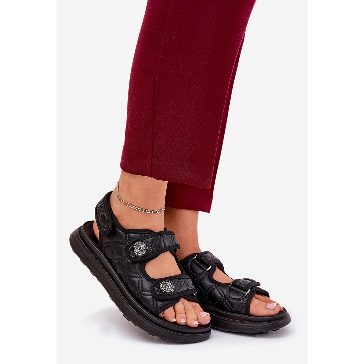 Upptäck de unika kvinnors sandaler med dekorativa kardborrdetaljer i minimalistiska svart, som kombinerar stil, komfort och funktionalitet. Dessa sandaler är gjorda av högkvalitativa ekoläder och är perfekta för sommarstyliseringar. De ligger på en 3 cm hög plattform och ger komfort att bära hela dagen, vilket gör dem till det perfekta valet på varma dagar.
