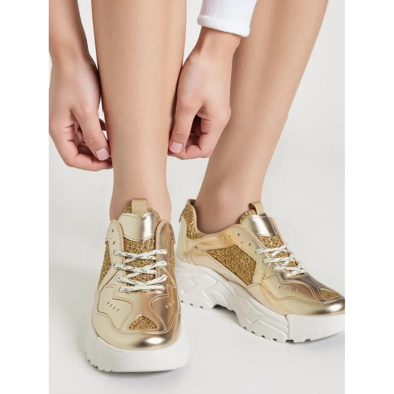 Kvinnors sneakers Lumina Gold är ett bra val för kvinnor som vill kombinera komfort med fashionabla stil. Deras lyxiga utseende, betonat av metalliska gyllene element och glitterdetaljer, fångar ögat och lägger stil till alla stilisering. Den höga, tjocka sulan säkerställer inte bara komfort hela dagen, utan också optiskt förlänger benen, vilket är en ytterligare fördel.