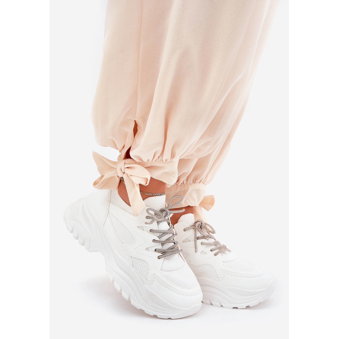 Kvinnors sneakers på plattformen med dekorativ vit snörning är ett bra förslag för kvinnor som vill kombinera fashionabla stil med komfort varje dag. Dessa slip -up skor kännetecknas av en massiv 4 cm hög sula, som inte bara höjer figuren, utan också säkerställer stabilitet och komfort när man går.
