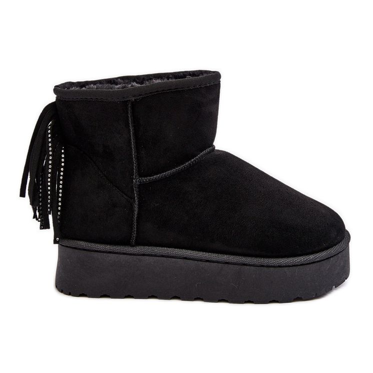 Kvinnors Lirico Snow Boots - Varma, eleganta och bekväma för svalare dagar. Tillverkad av ekologisk mocka i universal svart, monterad på en massiv gummisula (4 cm plattform). Den övre når vristen och har dekorerats med dekorativa fransar på baksidan, och interiören är vadderad med tjock päls, vilket säkerställer termisk komfort under hösten/vintersäsongen.