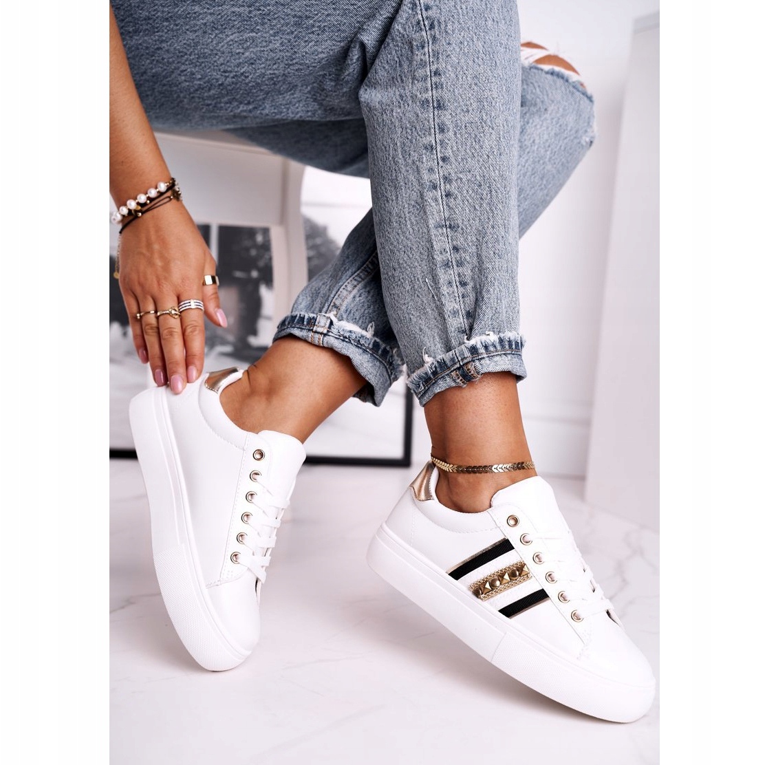 Lär känna kvinnors vita Rylee sportskor från tillverkaren FB1, som kombinerar lätthet, komfort och moderiktig design. Perfekt för vardagliga promenader och aktiviteter, dessa skor är bekväma att bära, som klassiska sneakers. Ovandeln gjord av högkvalitativt ekologiskt läder med målade inlägg lockar inte bara uppmärksamhet, utan garanterar också hållbarhet.