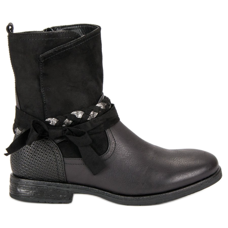Svarta arbetarstövlar kännetecknas av sin ovanliga design, som kombinerar svårighetsgrad med feminin charm. En intressant dekoration i ankelhöjd, i form av en svart och silver textilfläta med ett band i form av en båge, ger dem en original karaktär. Detta gör dem perfekta för både klassiska och rockiga stilar.