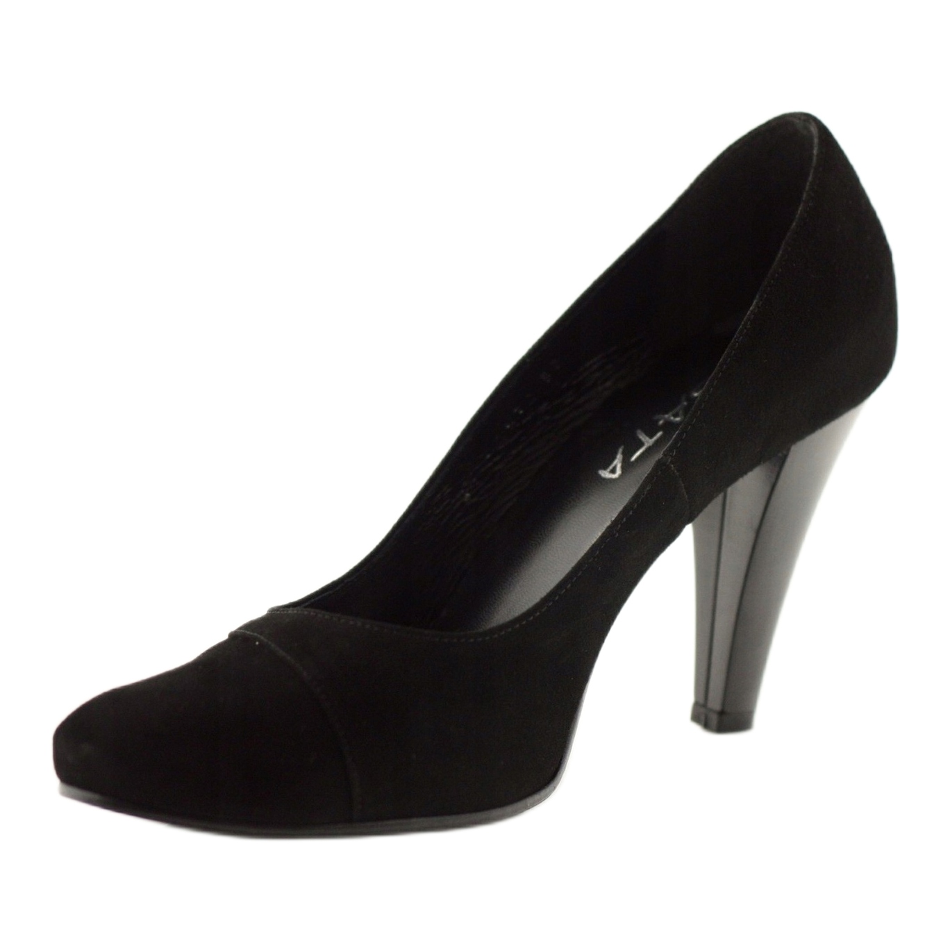 Pumpar av det polska märket Edeo, modell 1071, helt gjorda av naturligt nubuckläder, kombinerar en klassisk form med en subtil, glänsande accent av silvertråd och känsliga zirkoner. En stabil 9 cm blockhäl säkerställer självsäkert steg och komfort hela dagen, och den runda tån ger en klassisk karaktär. Slip-on design och läder innersula förbättrar användarkomforten; en sula gjord av slitstarkt syntetiskt material garanterar motstånd mot dagligt bruk.