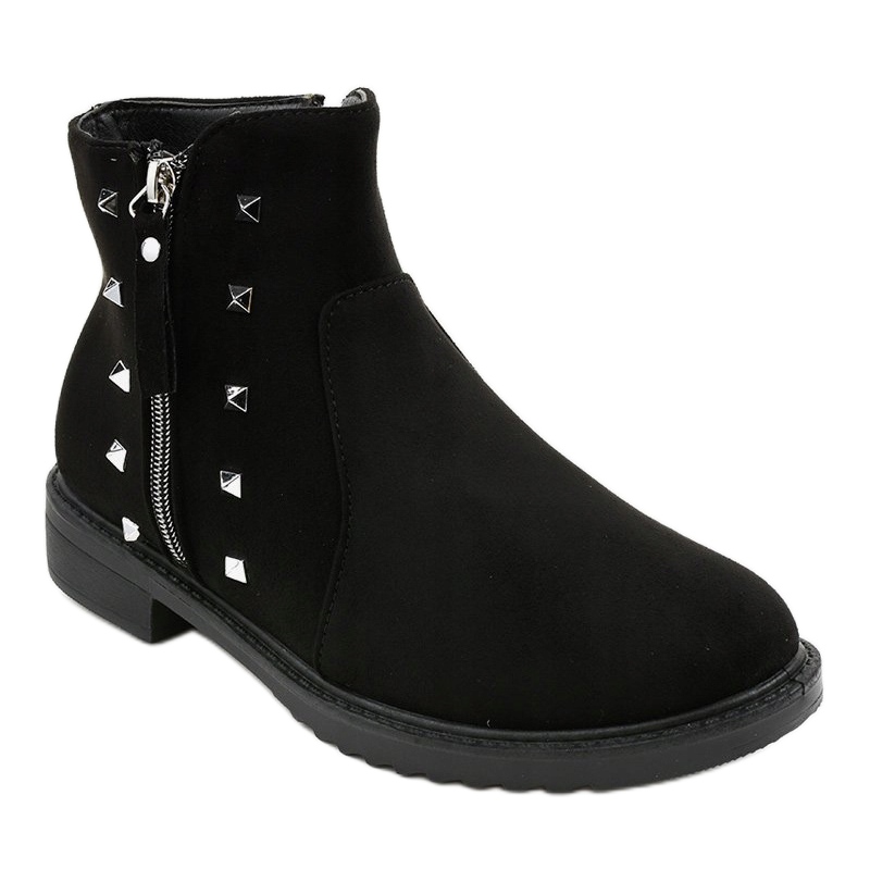 Den funktionella dragkedjan gör den enkel att ta av och på, och den extra dekorativa dragkedjan och metalliska strass ger skorna ett modernt och moderiktigt utseende. Skornas höjd är 14 cm och sulan är gjord av syntetmaterial vilket säkerställer hållbarhet och estetik.
