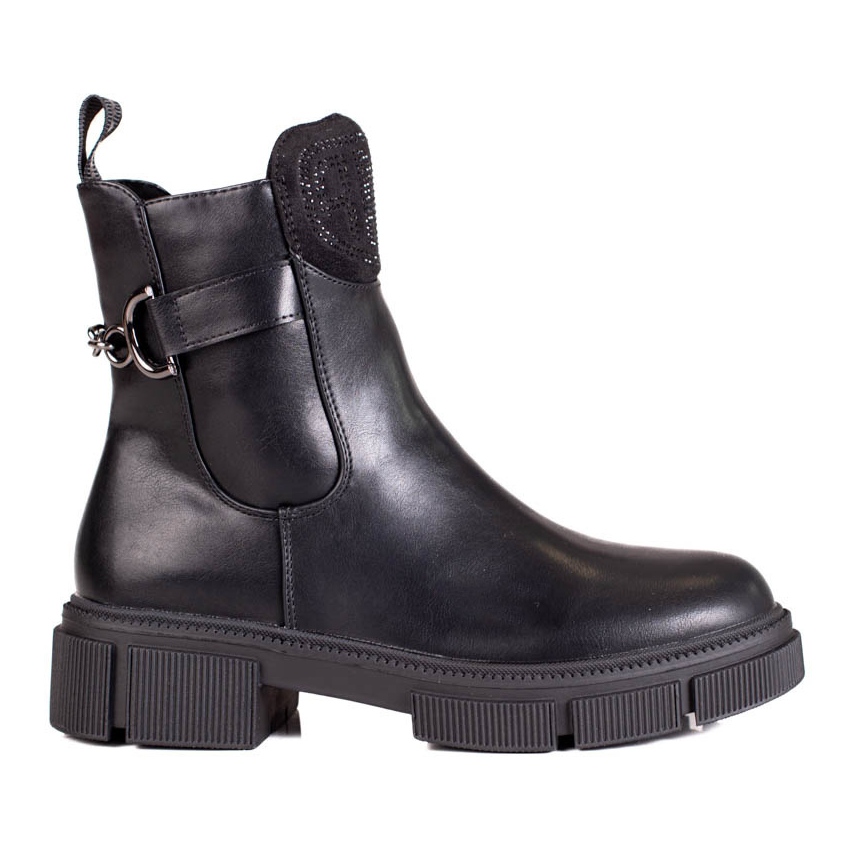 Eleganta, svarta kvinnors stövlar på en lätt plattform, perfekt för hösten/vintersäsongen. Tillverkad av ekologiskt läder, med en isolerad pälsinsats och ett textilfoder, kombinerar fashionabel, avslappnad design med vardagens funktionalitet. Delikata dekorationer i form av zirkoner och en kedja lägger till karaktär, utan att ge upp universalitet.