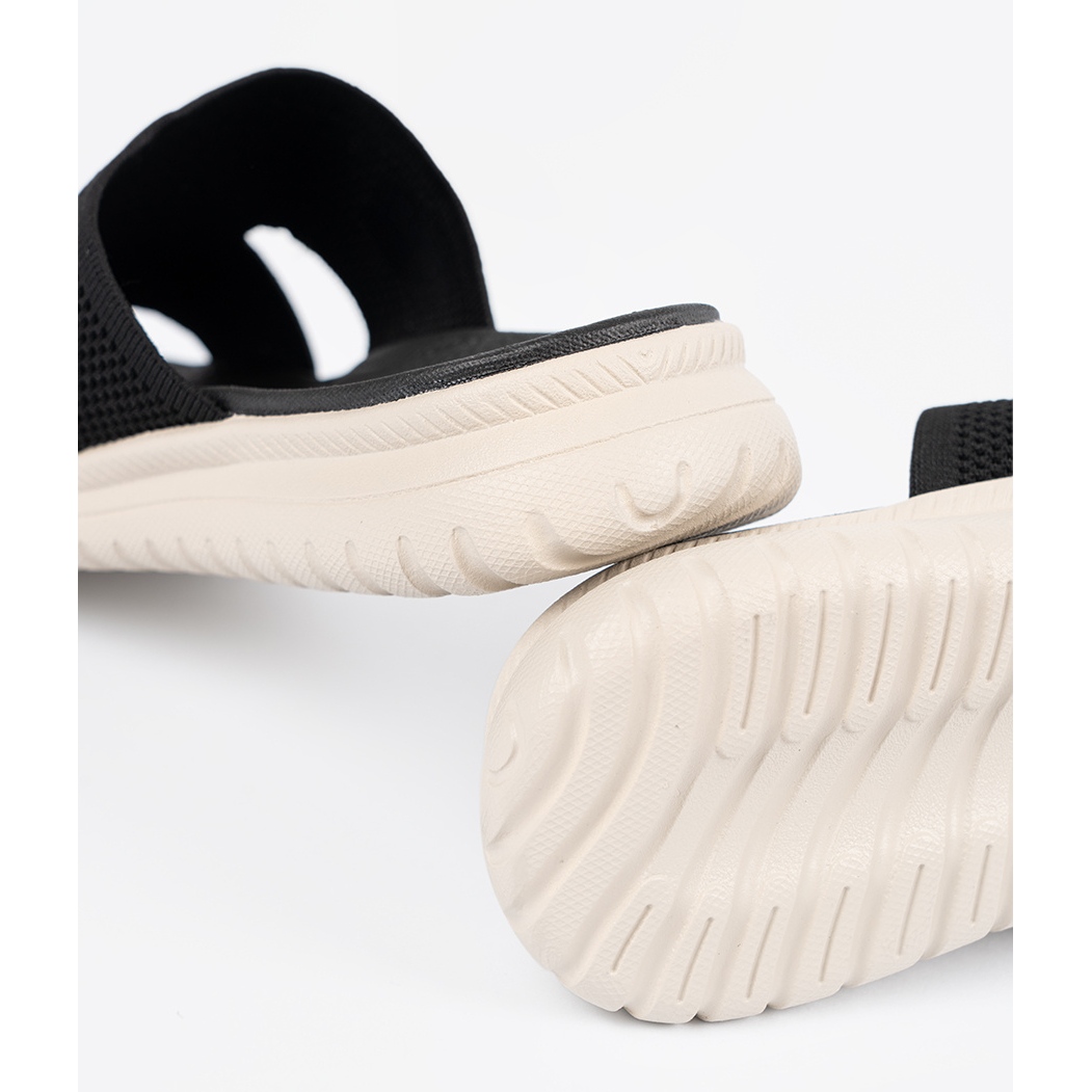 Svart flip -flops smälter perfekt in med en mängd stiliseringar. Du kan enkelt kombinera dem med både avslappnade byxor och luftiga klänningar, och beige -sulan kommer subtilt att betona hela figuren.