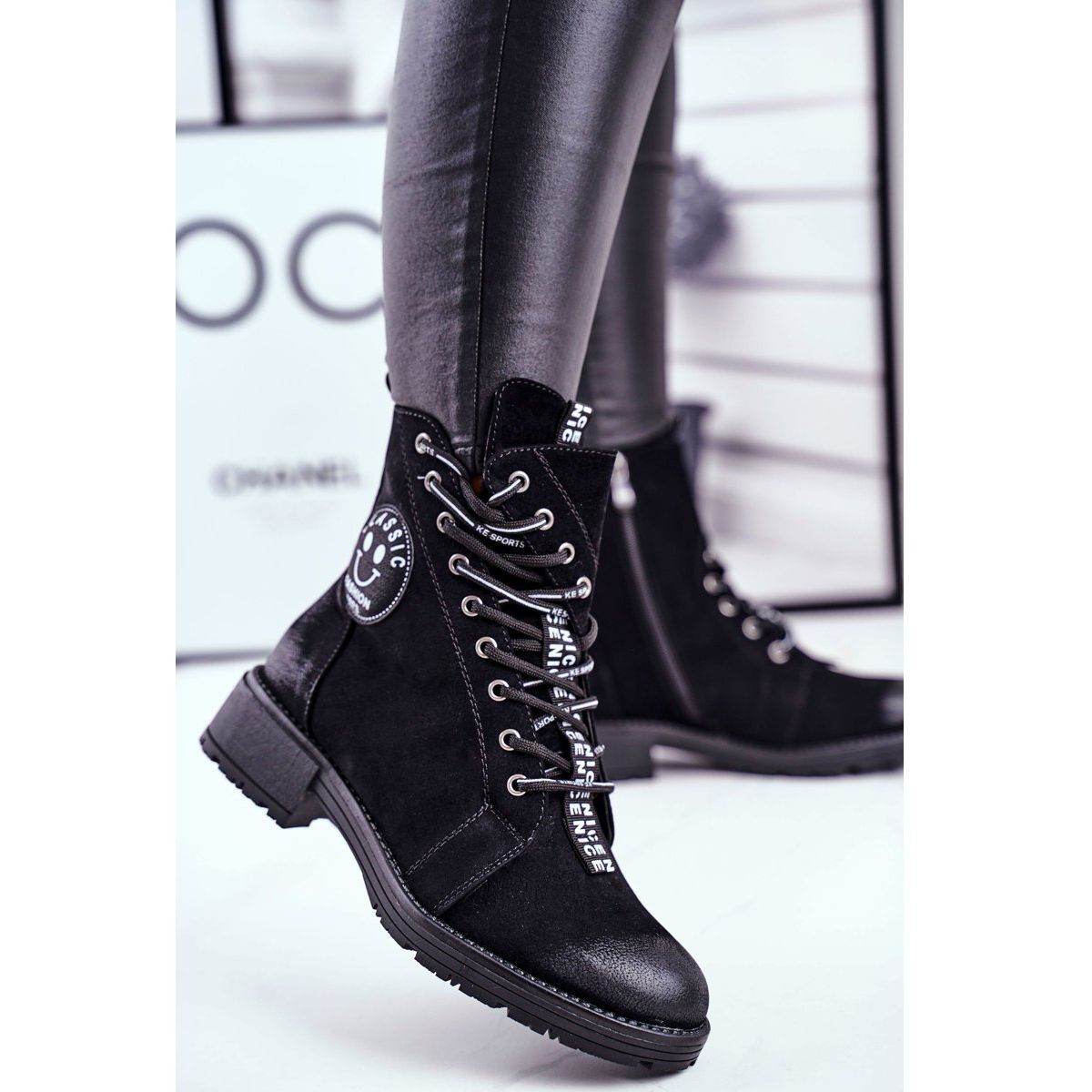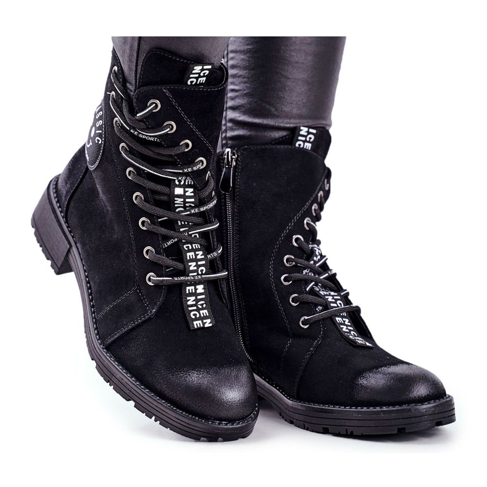 Stövlarna har en rund tå och designades med känsla för detaljer. Dekorerade med en svart rand med inskriptionerna "NICE" och ovanlig snörning, kommer de säkerligen att locka uppmärksamhet och få all styling att sticka ut. En platt 4 cm hög klack gör den bekväm att bära hela dagen, och den övre höjden på 14 cm ger karaktär och attraktivitet.