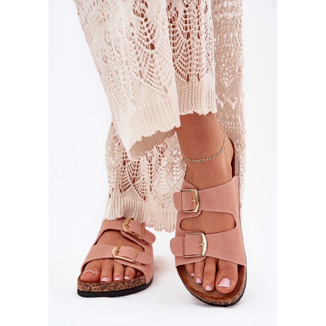 Information: Kvinnors tofflor på en korkplattform med gyllene klämmor rosa
