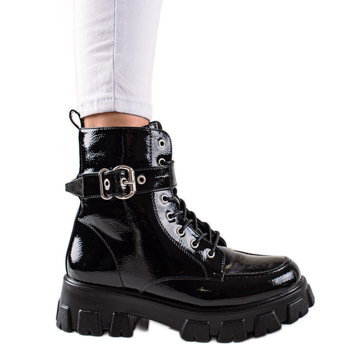 Vi presenterar arbetarstövlar i lackläder med spänne i en elegant svart färg från varumärket TRENDI, som säkerligen kommer att bli ditt favoritelement i din garderob inför den kommande höst/vintersäsongen. Dessa fashionabla ankelboots kombinerar en djärv rockstil med en avslappnad karaktär som perfekt matchar de senaste trenderna.