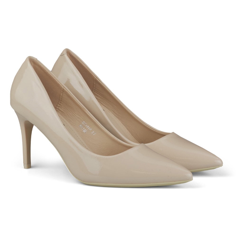 Elegant lackerade beige kvinnors pumpar - en klassiker i en modern upplaga. Tillverkad av ekologiskt lackerat läder, med en långsträckt, spetsig näsa och en smal stift med en höjd av 8 cm. Perfekt som ett komplement till både kvällstyliseringar och mer formella kontor.