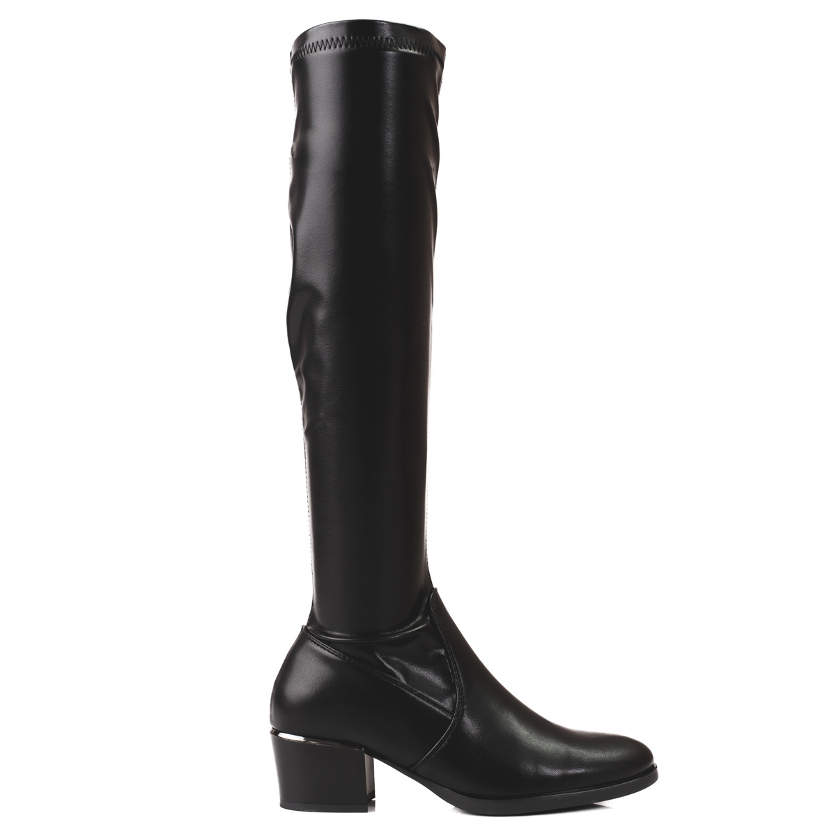 Dampatenta lågklackade Vinceza-stövlar i svart är ett perfekt val för varje kvinna som vill kombinera elegans med komfort. Det klassiska snittet ovanför knäet med en inbyggd, förstyvad häl och en rund tå ger dem en unik karaktär, och de låga 5 cm höga klackarna säkerställer stabilitet och komfort, perfekt för vardagsbruk.