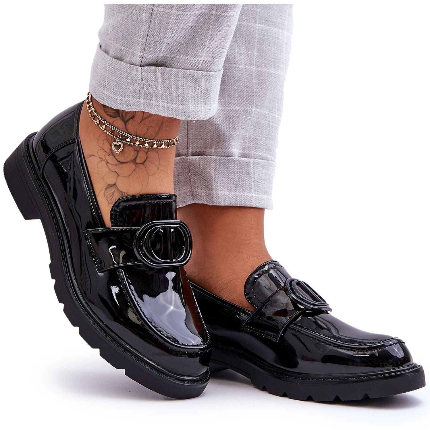 Vi presenterar snygga och bekväma skor för den moderna kvinnan - PG1 Patent Leather Moccasins on a Platform, Black Jarren. Dessa eleganta skor kombinerar de klassiska egenskaperna hos mockasiner med modern design och är det perfekta komplementet till en varierad garderob.